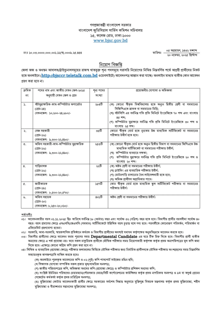 বাংলাদেশ জুডিসিয়াল সার্ভিস কমিশন কর্তৃপক্ষ তাদের অফিসিয়াল ওয়েবসাইটে ২০ নভেম্বর ২০২৫ ইং তারিখে BJSC Job Circular 2025 প্রকাশ করেছে। দেশের বিভিন্ন জেলায় যোগ্য নারী–পুরুষ প্রার্থীদের মধ্য থেকে ৬টি বিভিন্ন ক্যাটাগরির পদে মোট ১,১৫২ জনকে স্থায়ীভাবে নিয়োগ দেওয়ার ঘোষণা এসেছে।