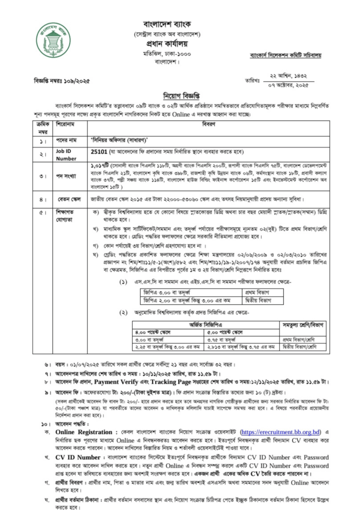 বাংলাদেশ ব্যাংকের ব্যাঙ্কার্স সিলেকশন কমিটির অধীনে ৯ টি ব্যাংক ও ২ টি আর্থিক প্রতিষ্ঠানে মোট ১০১৭ জনকে নিয়োগ দেওয়া হবে। সিনিয়র অফিসার (সাধারণ) পদ — যোগ্যতা, বয়সসীমা, আবেদন পদ্ধতি ও শেষ তারিখ (১০ নভেম্বর ২০২৫)।