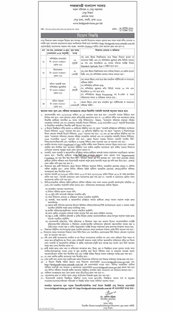 প্রার্থীদের অনলাইনে আবেদন করতে হবে 👉 https://bridgesdivision.teletalk.com.bd/