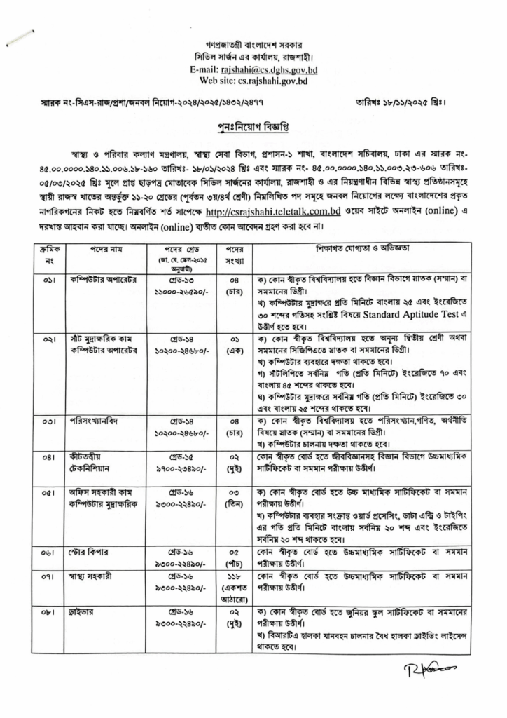 রাজশাহী সিভিল সার্জন কার্যালয় মোট ০৮টি পদে ১৩৯ জন উপযুক্ত নারী ও পুরুষ নিয়োগ দেবে। বেতন প্রদান করা হবে জাতীয় বেতন স্কেল ২০১৫ অনুযায়ী।