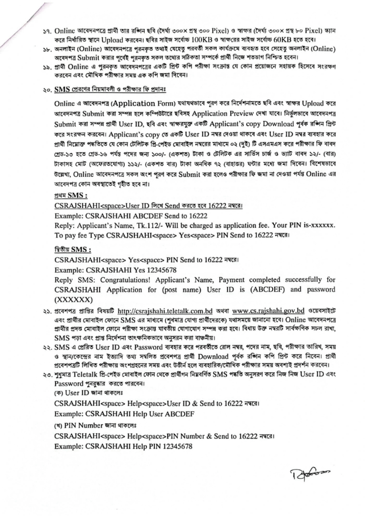 https://csrajshahi.teletalk.com.bd - আবেদন ফি ১১২ টাকা, যা টেলিটক প্রিপেইড সিম ব্যবহার করে ২টি SMS-এর মাধ্যমে জমা দিতে হবে