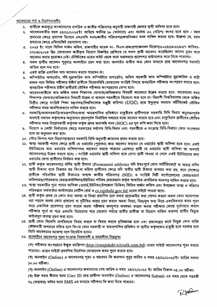 যোগ্যতা, বয়স, অভিজ্ঞতা ও অন্যান্য শর্ত পূরণ সাপেক্ষে বাংলাদেশের নির্ধারিত জেলার প্রার্থীরা অনলাইনের মাধ্যমেই আবেদন করতে পারবেন। আবেদন করতে হবে https://csrajshahi.teletalk.com.bd ওয়েবসাইটে প্রবেশ করে অনলাইন ফরম পূরণের মাধ্যমে।