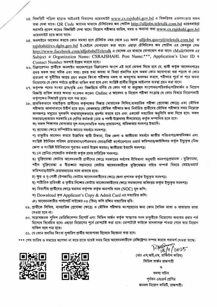 রাজশাহী সিভিল সার্জন কার্যালয় নিয়োগ বিজ্ঞপ্তিতে বেতন, শিক্ষাগত যোগ্যতা, বয়সসীমা, প্রয়োজনীয় নথি, আবেদন শর্তসহ সকল তথ্য ছবিসহ প্রকাশ করা হয়েছে। চাকরিতে আবেদনের আগে অবশ্যই অফিসিয়াল বিজ্ঞপ্তির ইমেজ ভালোভাবে পড়ে নিশ্চিত হয়ে আবেদন করা উচিত।