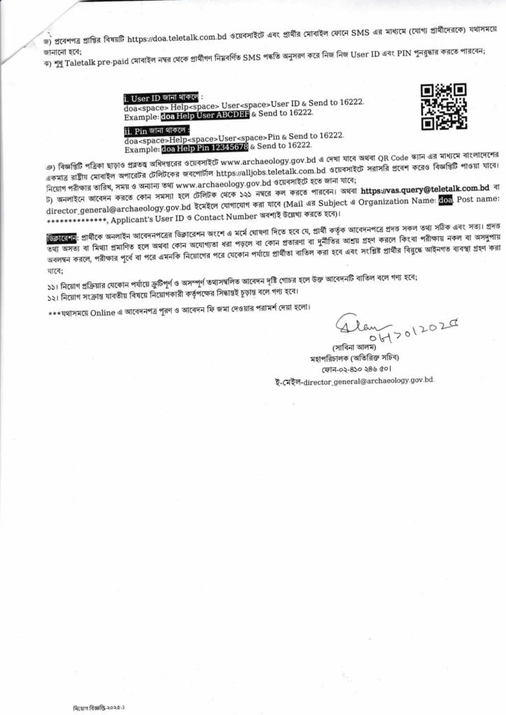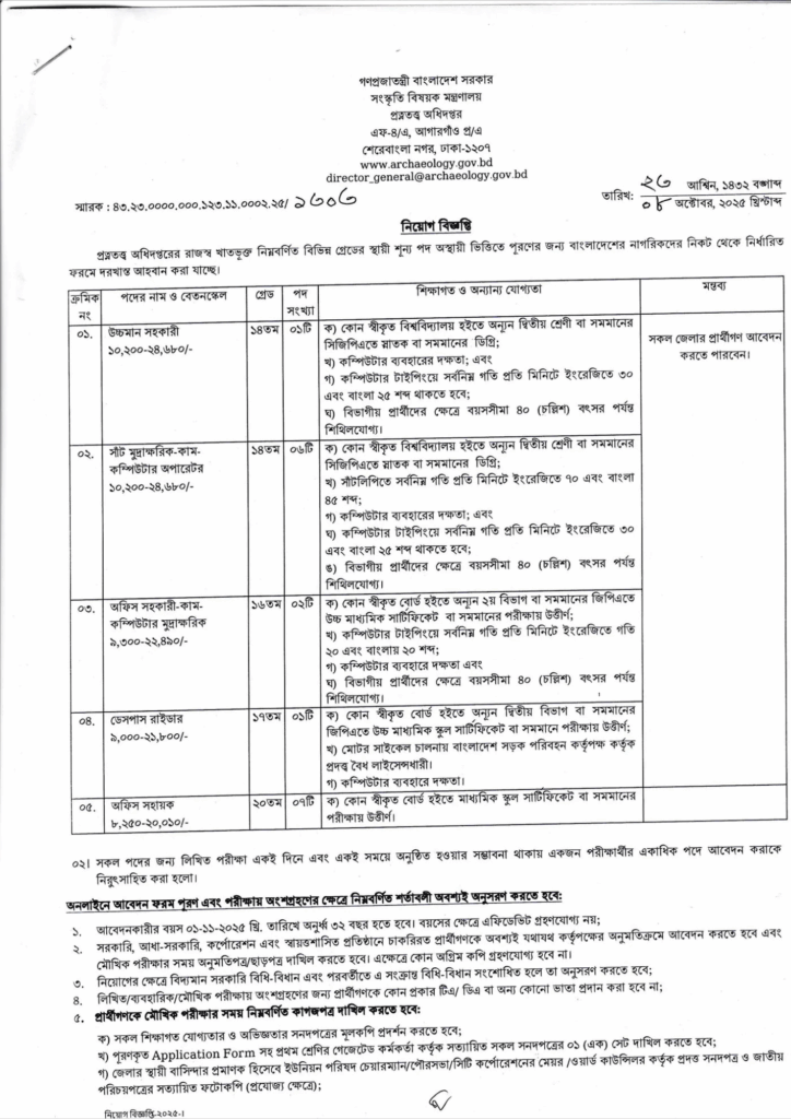 নিচে প্রত্নতত্ত্ব অধিদপ্তর নিয়োগ বিজ্ঞপ্তি ২০২৫-এর অফিসিয়াল ইমেজ/PDF সংযুক্ত করা হয়েছে। আবেদন করার পূর্বে সার্কুলারটি মনোযোগ সহকারে পড়ে নিন, যাতে পদের যোগ্যতা, আবেদন প্রক্রিয়া ও শর্ত সম্পর্কে বিস্তারিতভাবে জানা যায়।