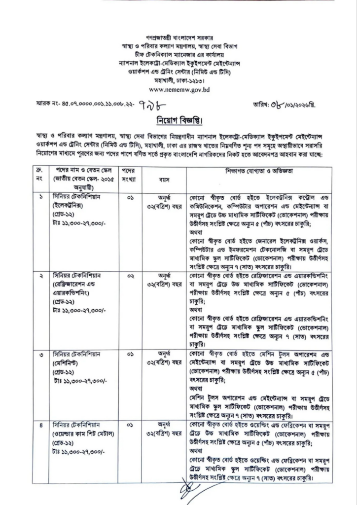 ন্যাশনাল ইলেকট্রো-মেডিক্যাল ইকুইপমেন্ট মেইনটেন্যান্স ওয়ার্কশপ এন্ড ট্রেনিং সেন্টার (NEMEMW) কর্তৃপক্ষ নিমিউ এন্ড টিসি নিয়োগ বিজ্ঞপ্তি ২০২৬ প্রকাশ করেছে। সরকারি এই নিয়োগ বিজ্ঞপ্তিটি ০৮ জানুয়ারি ২০২৬ খ্রিস্টাব্দে অফিসিয়ালি জারি করা হয় এবং ০৯ জানুয়ারি ২০২৬ ইং দৈনিক প্রথম আলো পত্রিকায় প্রকাশিত হয়।
