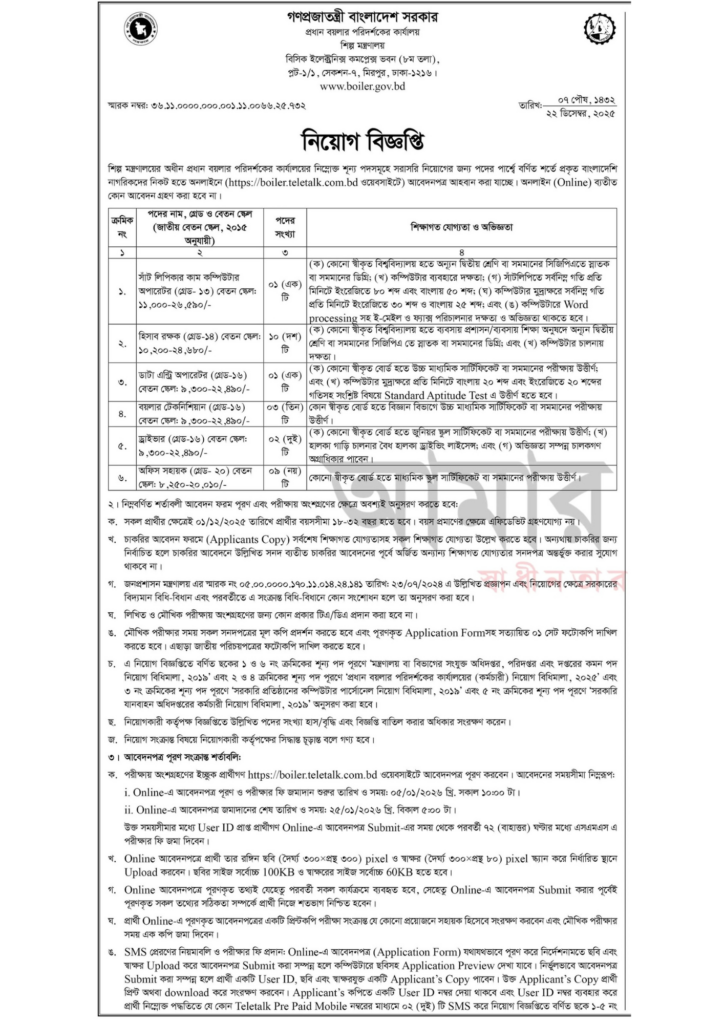 প্রধান বয়লার পরিদর্শকের কার্যালয় কর্তৃপক্ষ ২০২৬ সালের জন্য একটি নতুন নিয়োগ বিজ্ঞপ্তি প্রকাশ করেছে। এ নিয়োগ বিজ্ঞপ্তি অনুযায়ী মোট ০৬টি পদে ২৬ জন যোগ্য নারী ও পুরুষ প্রার্থীকে স্থায়ী সরকারি চাকরিতে নিয়োগ দেওয়া হবে। আবেদন প্রক্রিয়া সম্পূর্ণভাবে অনলাইনের মাধ্যমে সম্পন্ন করতে হবে।